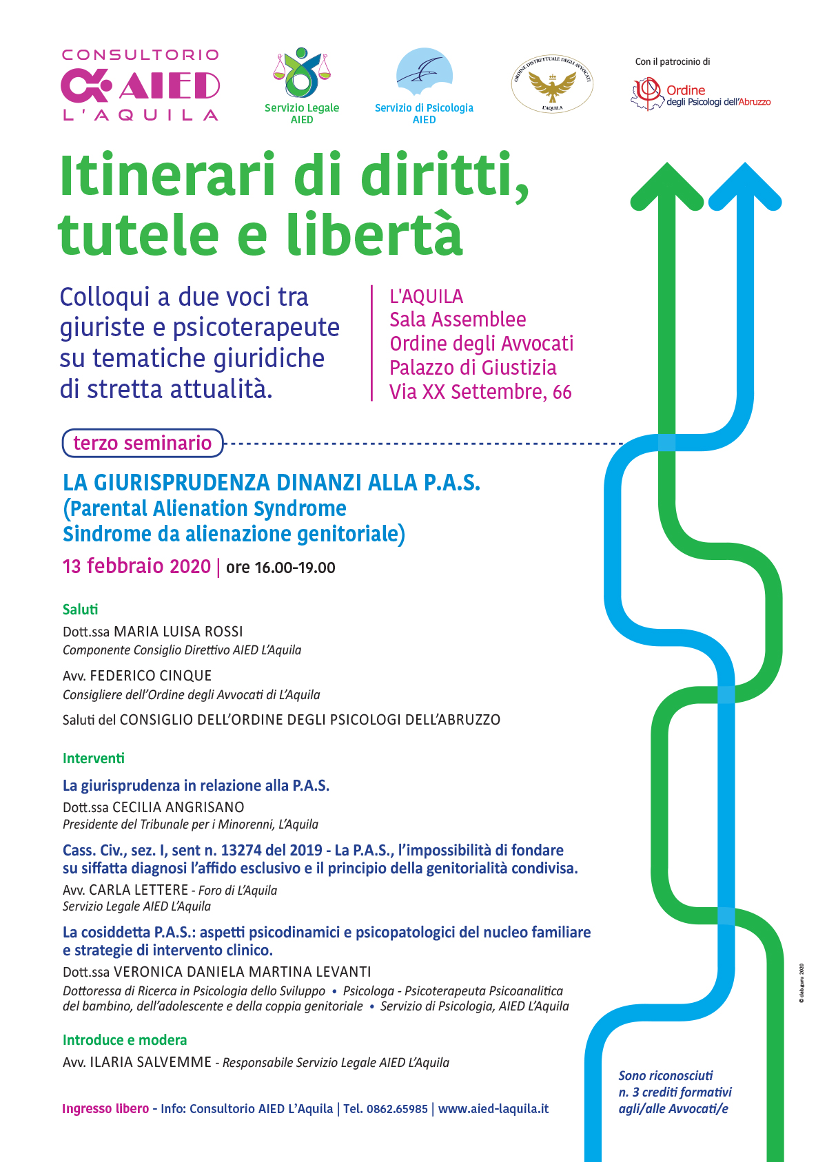 Itinerari di Diritti Tutele e Libertà “La giurisprudenza dinanzi alla P.A.S.” Itinerari di Diritti Tutele e Libertà “La giurisprudenza dinanzi alla P.A.S. (Parental Alienation Syndrome – Sindrome da alienazione genitoriale)” Di admin|2021-11-18T16:06:21+00:00Febbraio 13th, 2020|Convegni| Share This Article FacebookTwitterLinkedInWhatsAppTumblrPinterestVkEmail Post correlati Itinerari di Diritti Tutele e Libertà “La Concezione penalistica della persona e del feto” Itinerari di Diritti Tutele e Libertà “Il nuovo delitto di diffusione illecita di immagini o video sessualmente espliciti” Il c.d. Caporalato Il principio di precauzione nella tutela penale dell’ambiente