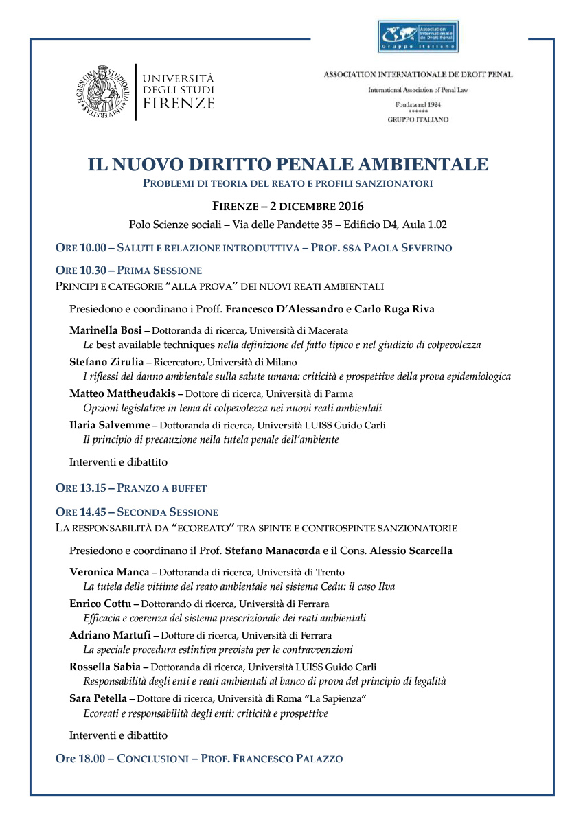 Nel 2016 sono stata relatrice nel Convegno “Il nuovo diritto penale ambientale”, presso l’Università degli Studi di Firenze